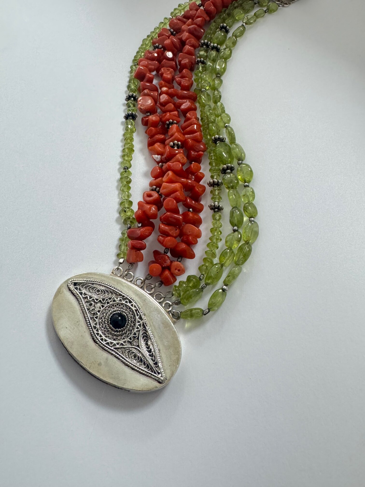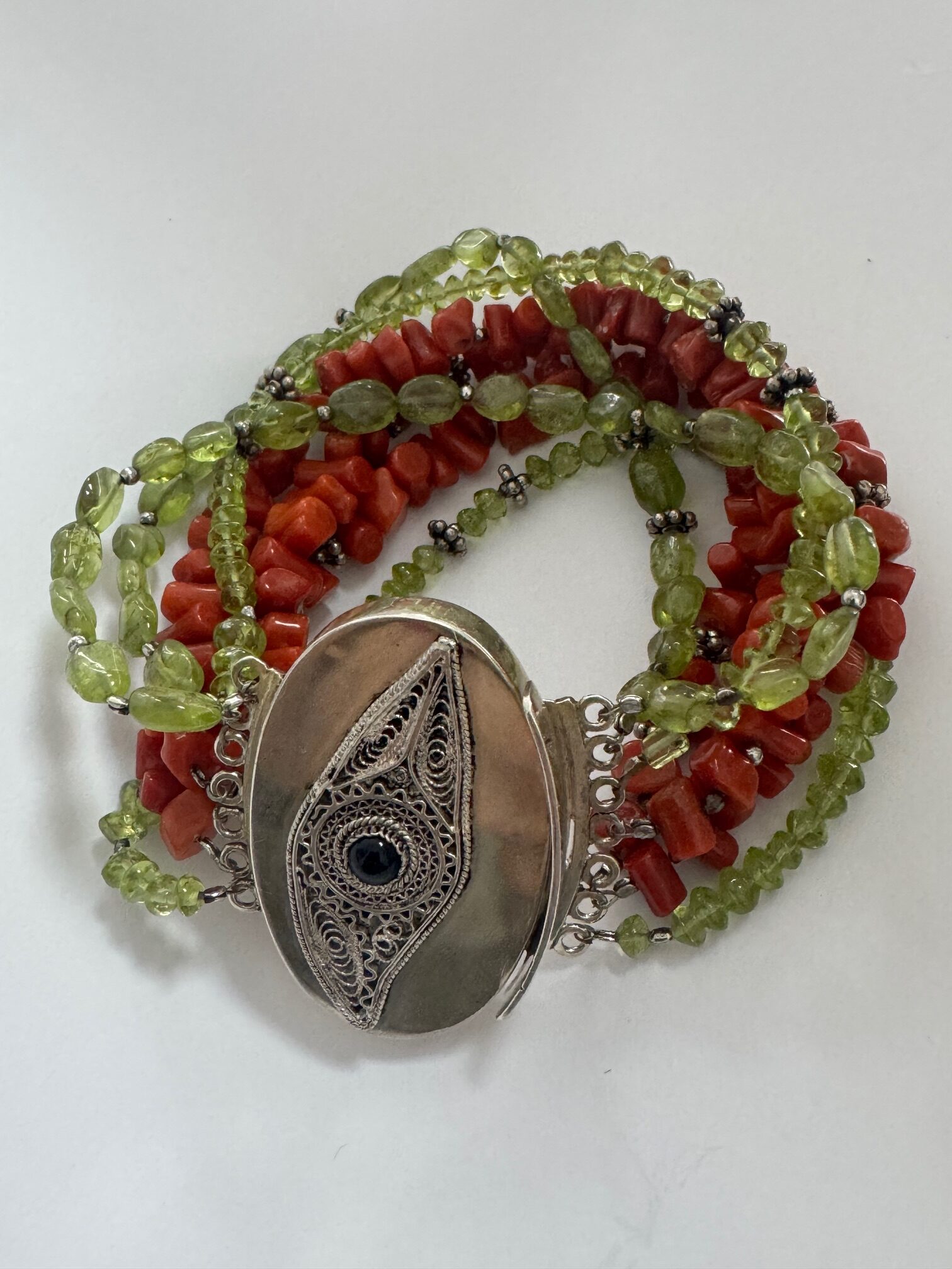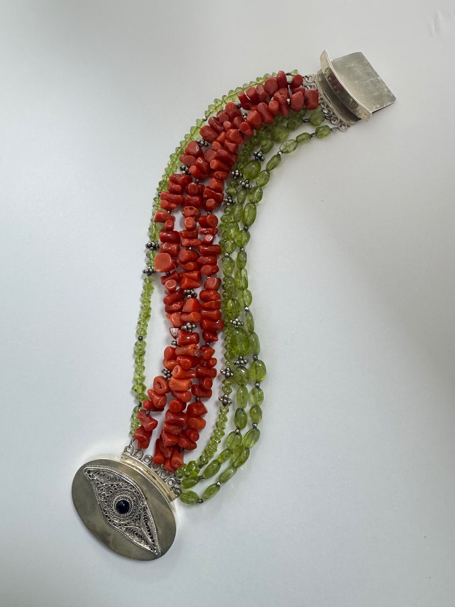 MATERIJAL:SREBRO + KORALJI + PERIDOT MASA: 81,09 G DUŽINA CCA: 22 CM, KADA SE ZAKOPČA: 20 CM VELIČINA LOKACIJA: MESNIČKA 2, ZG / 092 5000 550