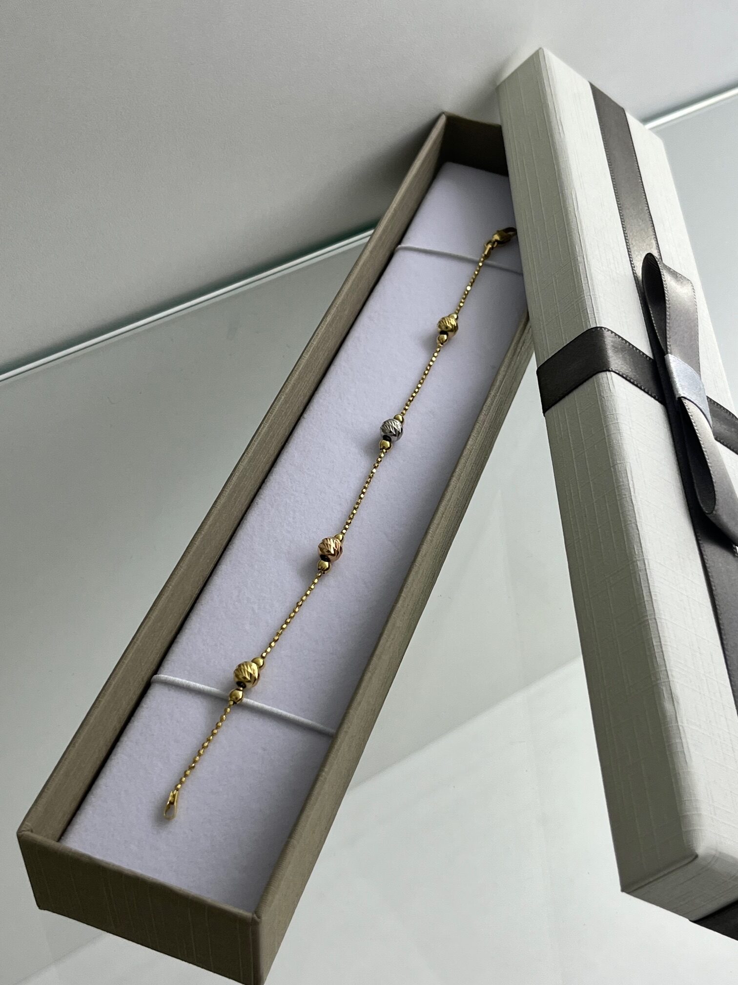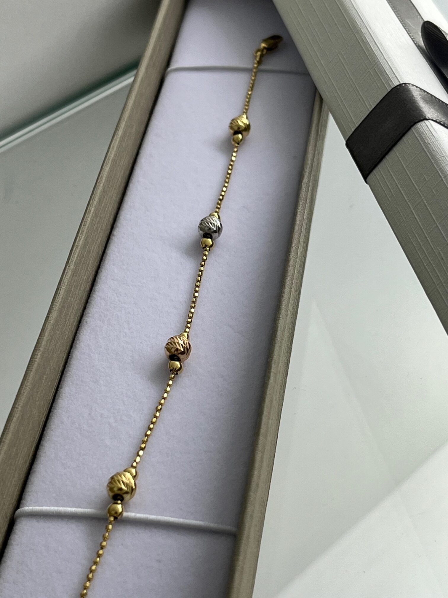 FINOĆA: 18 K / 750 MASA: 3,00 G STANJE: OČUVANA BOJA: ŽUTO ZLATO SA ŽUTIM, BIJELIM I ROSE GOLD KUGLICAMA. DUŽINA CCA: 17,5 cm LOKACIJA: MESNIČKA 2, ZG / 092 5000 550