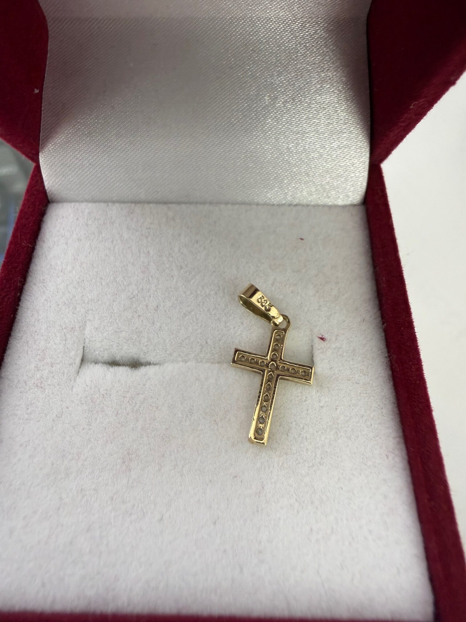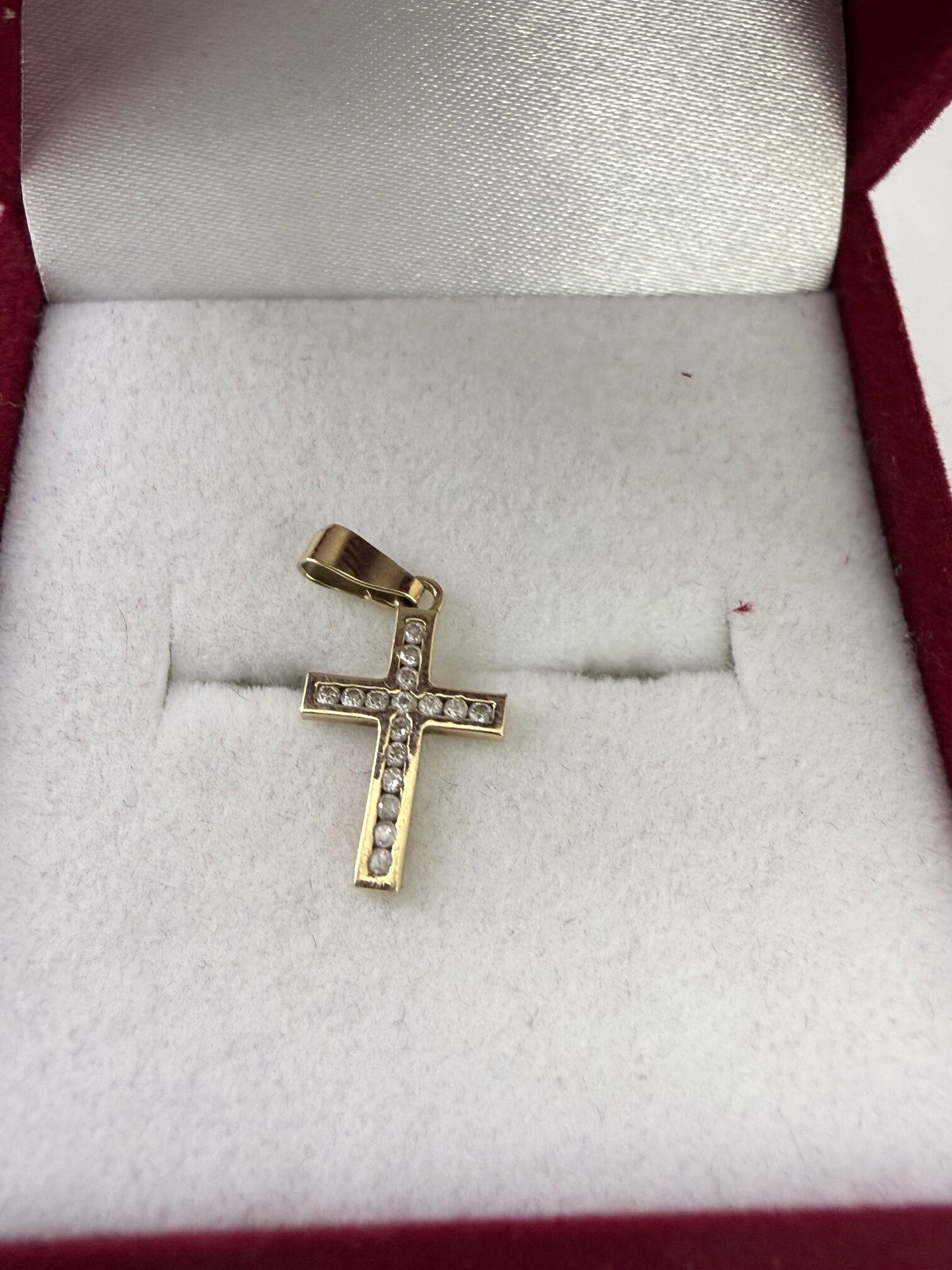 MALENI ZLATNI KRIŽ UKRAŠEN CIRKONIMA MASA: 0,71 G FINOĆA: 14 K / 585 STANJE: OČUVAN LOKACIJA: PAKOŠTANSKA ULICA 5 , ZG