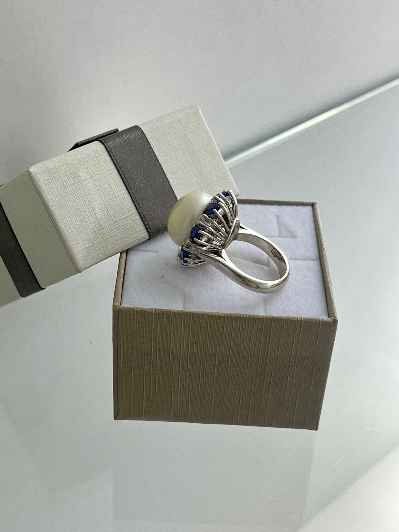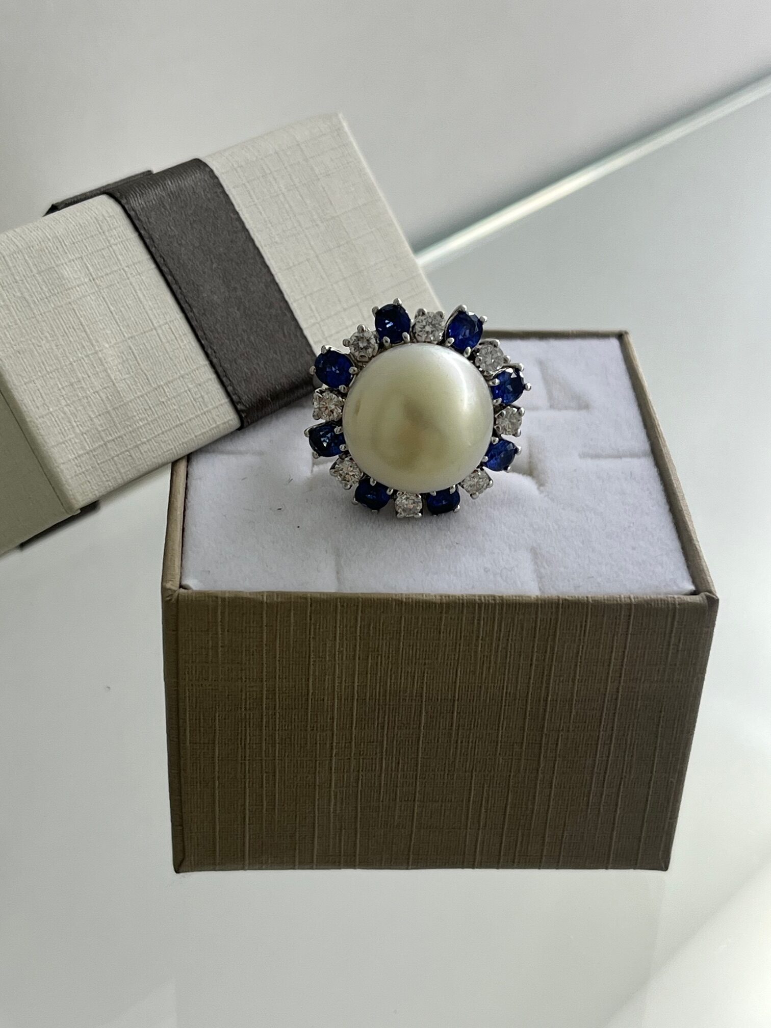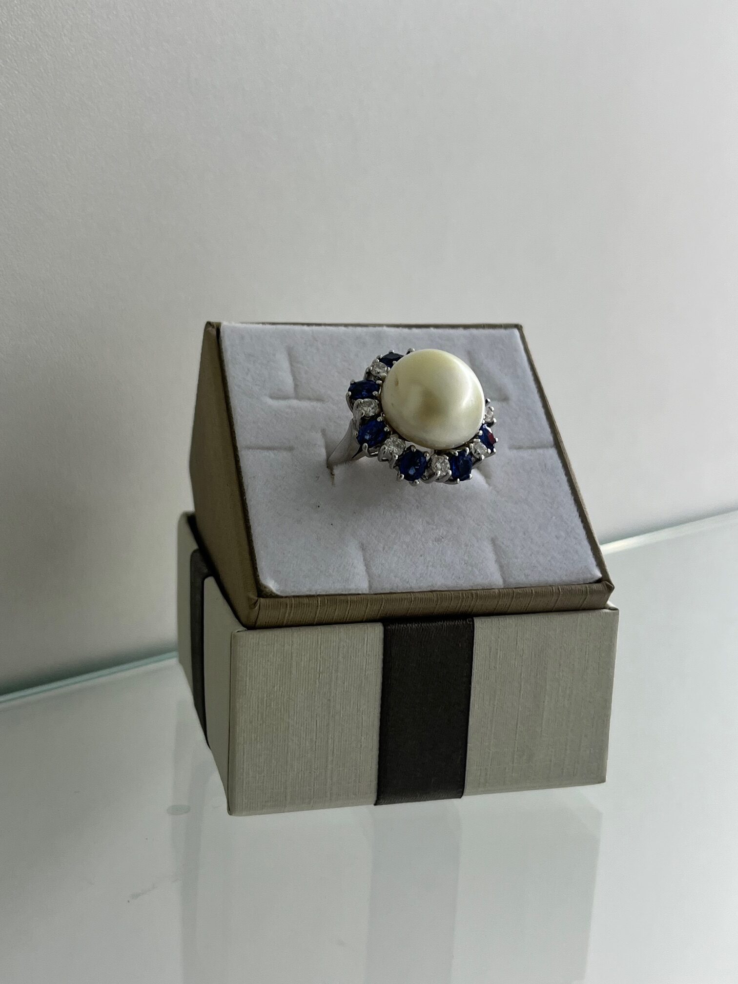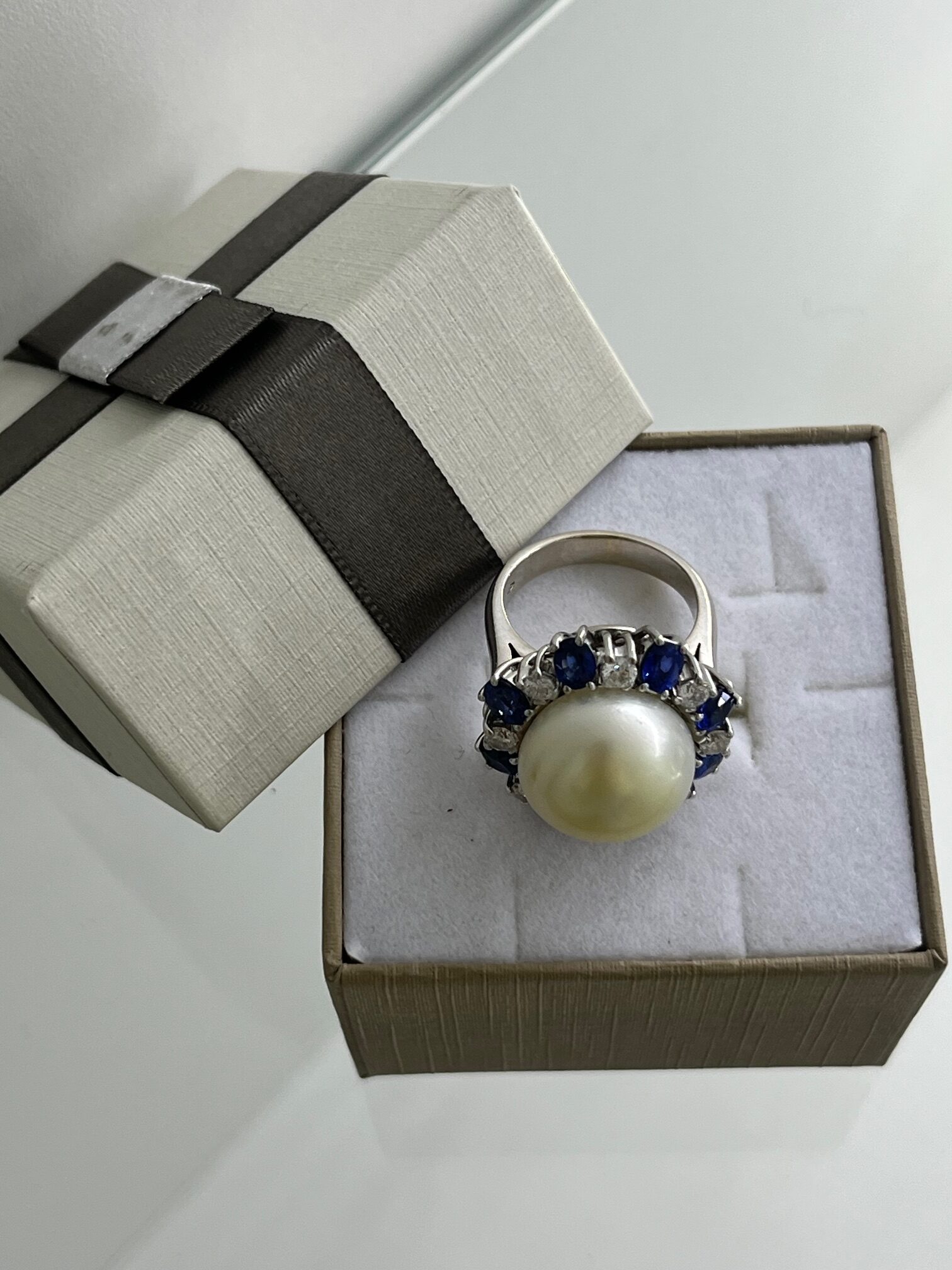 ZLATNI PRSTEN UKRAŠEN BISEROM, BRILJANTIMA, SAFIRIMA. MASA: 14,62 G FINOĆA: 18K / 750 BRILJANTI: CCA 0,56 CT SAFIRI CCA: 1,6 CT BOJA: BIJELO ZLATO STANJE: OČUVAN, OČIŠĆEN VELIČINA: 11/51 LOKACIJA: MESNIČKA 2, ZG/ 092 5000 550