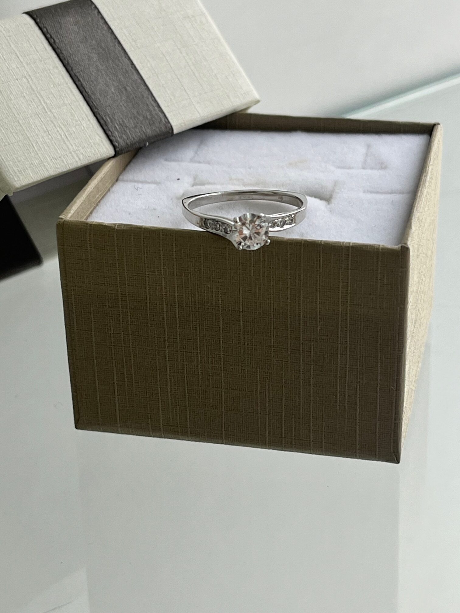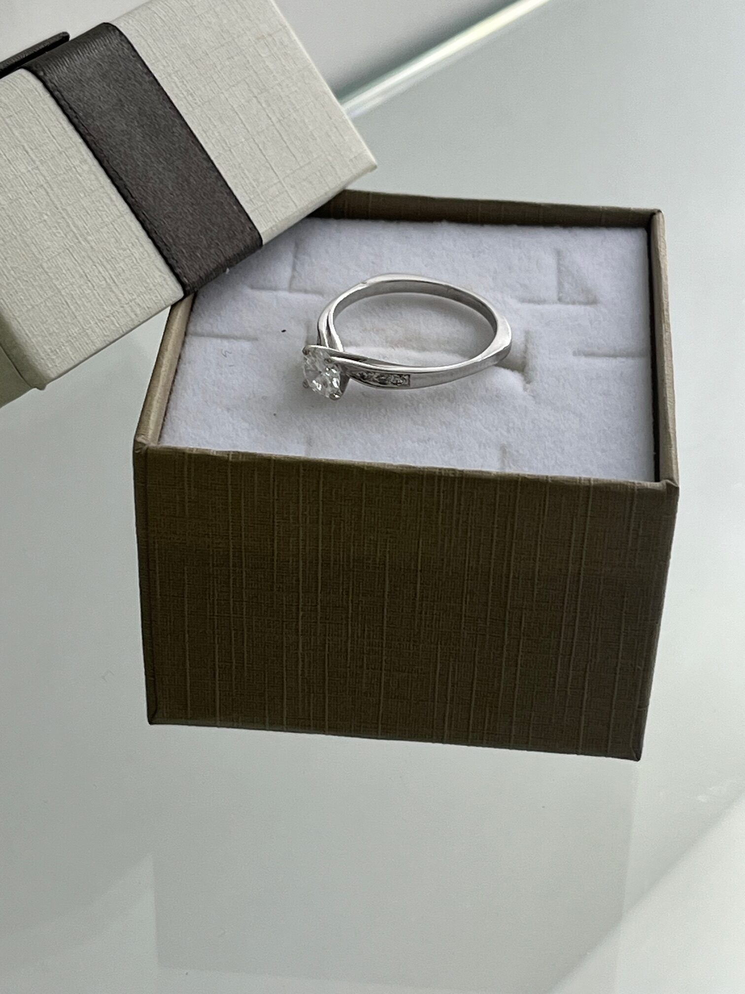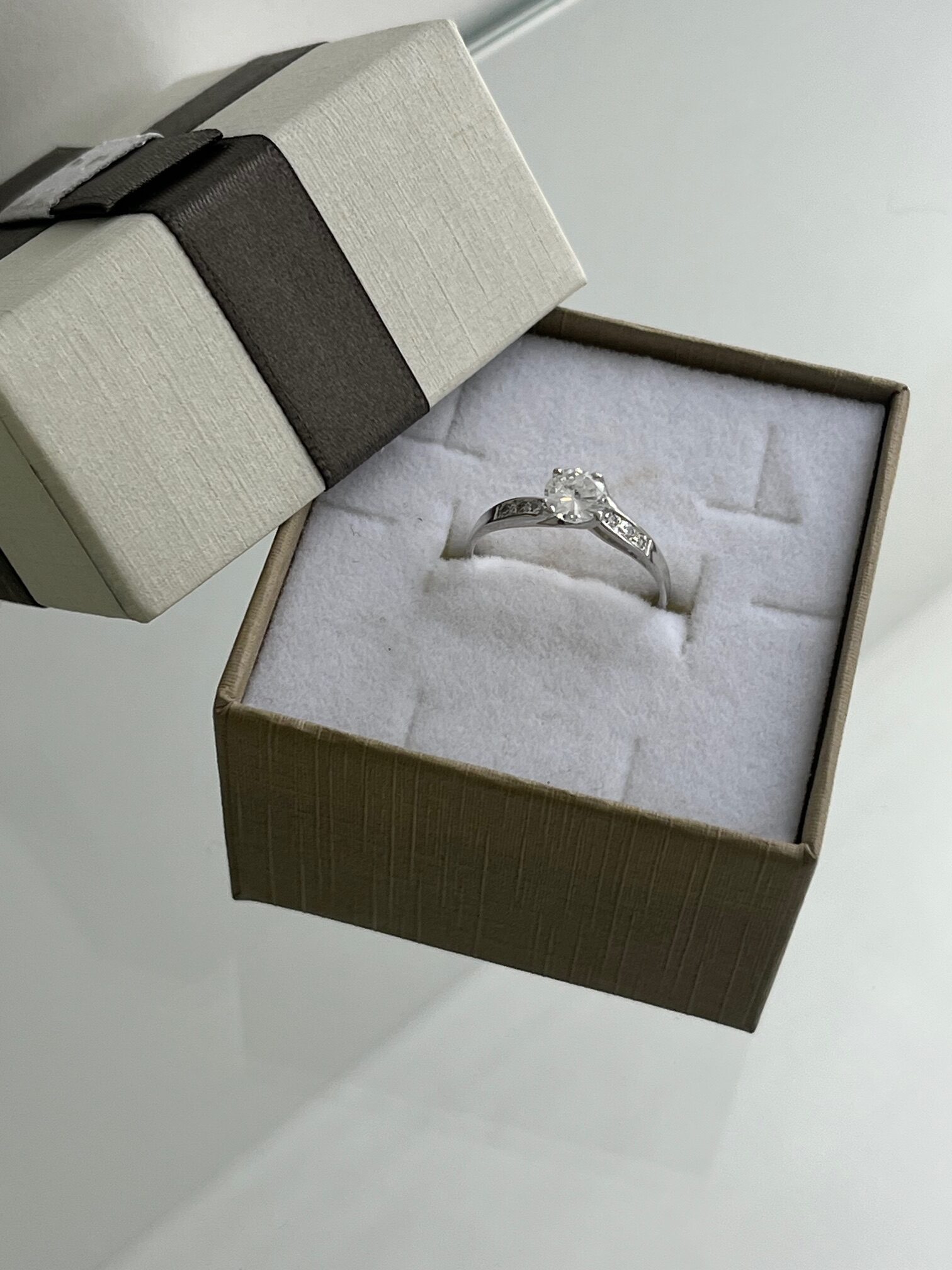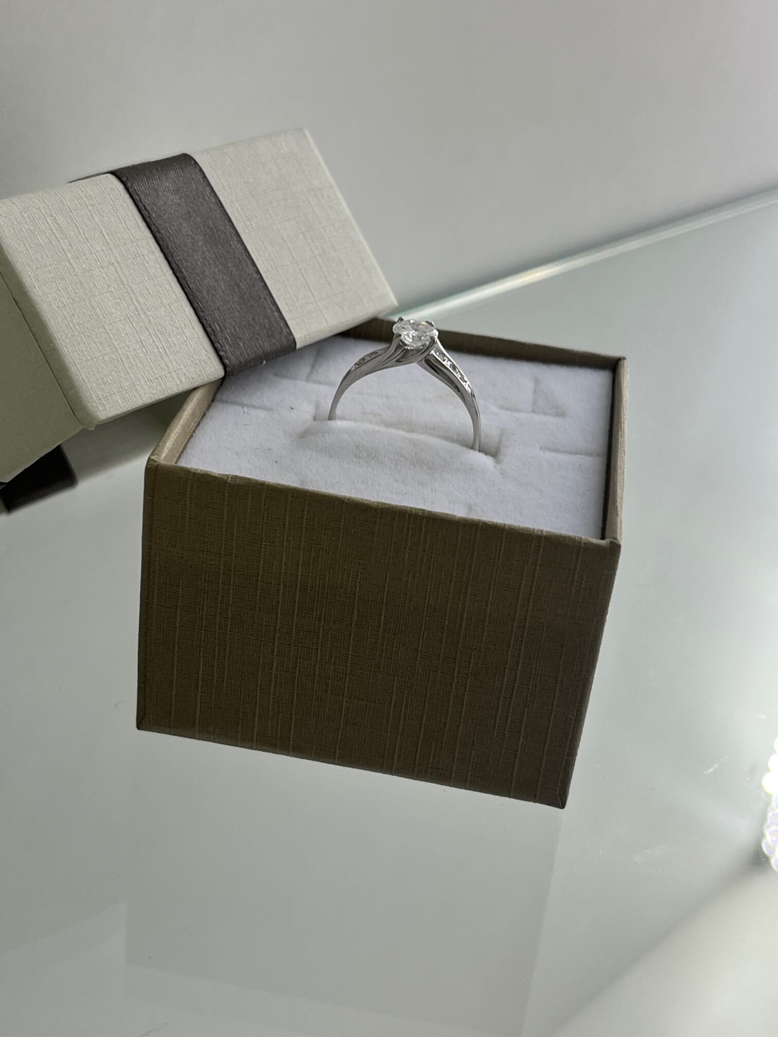 ZLATNI PRSTEN UKRAŠEN BRILJANTIMA MASA: 2,40 G FINOĆA: 18K / 750 BRILJANTI: CCA 0,50 CT / G / SI1 + 0,06 CT BOJA: BIJELO ZLATO STANJE: OČUVAN, OČIŠĆENV VEL 13/53 LOKACIJA: MESNIČKA 2, ZG/ 092 5000 550