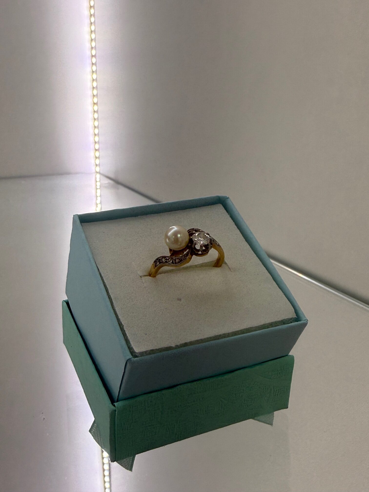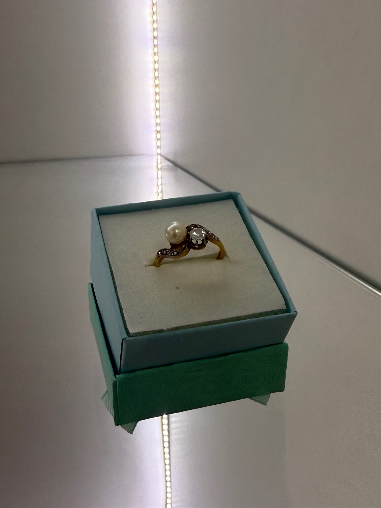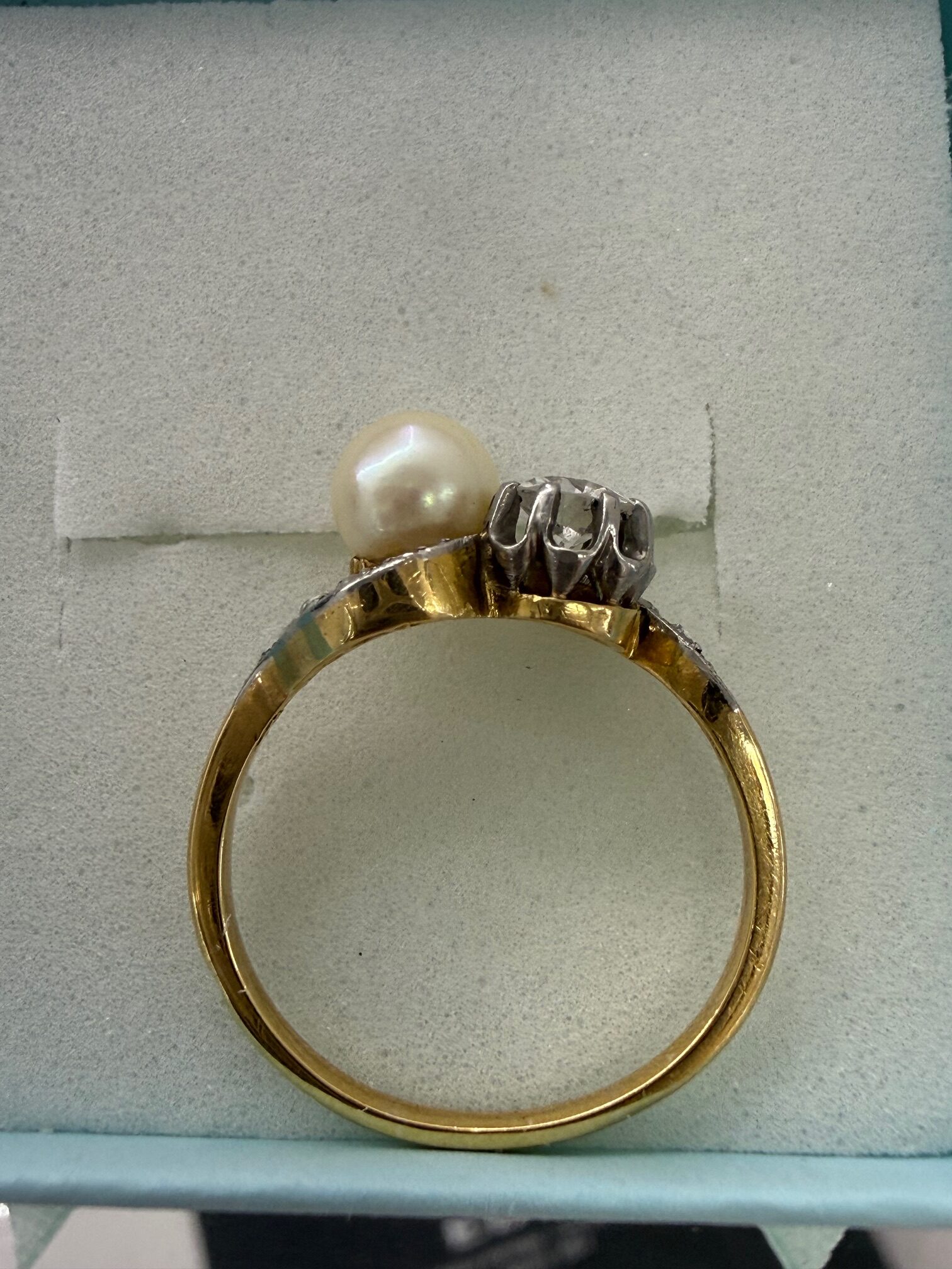 PRSTEN IZRAĐEN OD ZLATA TE GORNJI DIO OD SREBRA, UKRAŠEN PERLOM I DIJAMANTIMA. STARI BRUS DIJAMANT CCA: 1 X 0,20 CT + 10 X 0,01 CT CCA FINOĆA ZLATA: 18 K / 750 MASA: 3,21 G VELIČINA: 13,5 / 53,5 LOKACIJA: MESNIČKA 2, ZG / 092 5000 550